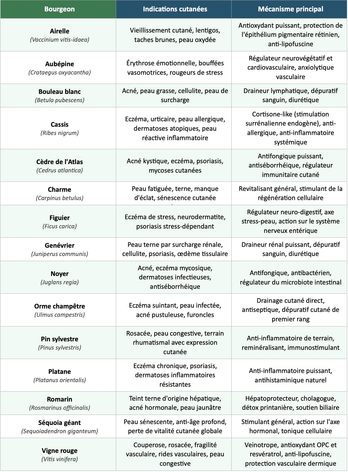 - Cibler votre terrain cutané → bourgeon adapté à votre profil (cèdre, platane, noyer, cassis…)
