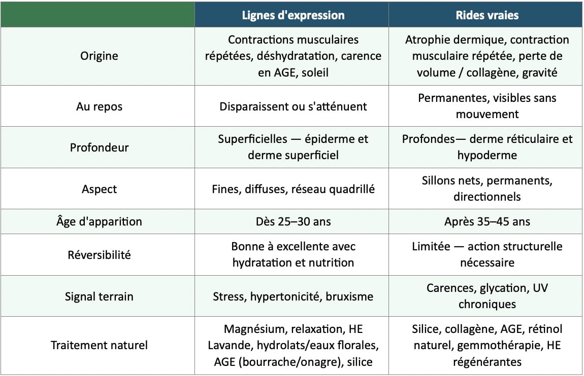 Les lignes sont comme du papier froissé : réhydratez, il se lisse. Les rides sont comme du cuir marqué : la trace reste, même hydratée. Traiter des lignes avec des techniques anti-rides est une erreur fréquente et coûteuse — commencer par la nutrition et l’hydratation de terrain suffit souvent à les effacer.