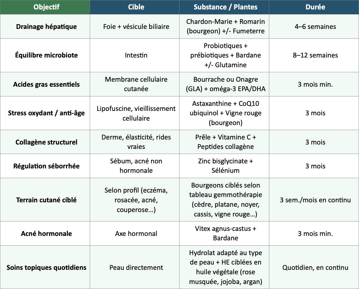 Un soin topique, aussi bien formulé soit-il, ne peut pas compenser durablement un intestin dysbiotique, un foie saturé ou des membranes carencées en acides gras. La logique intégrative consiste à toujours traiter les causes avant les symptômes.