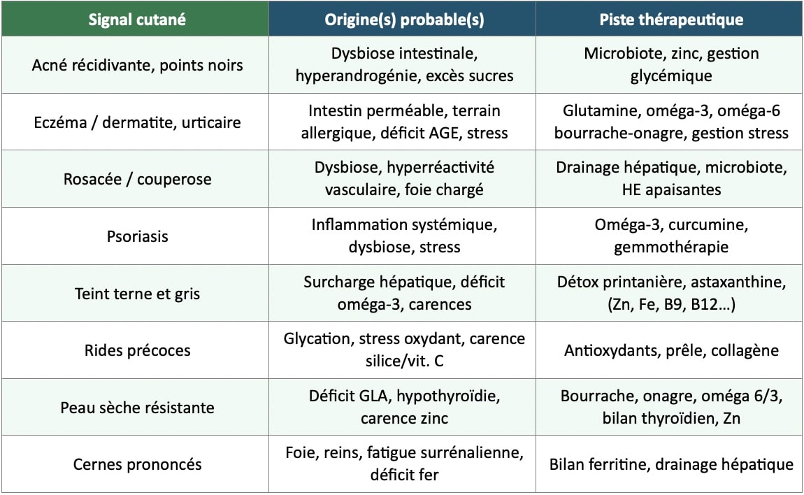 Lorsque ces mécanismes sont perturbés, la peau le signale. Ce tableau résume les correspondances les plus fréquentes en pratique clinique.